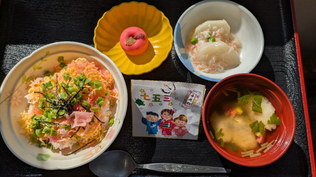 行事カードには華やかに着飾った子どもと長寿の象徴の鶴亀、千歳飴をあしらいお膳にのせて提供しました。